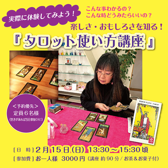 せまいお店ではありますが、テーブルがひとつあって、占いやカラーセラピーなど心の学びスクールや人生相談も行っています。時々イベントもあります。お気楽にいられるヒーリング・スペースとしてご利用いただけると幸いです。